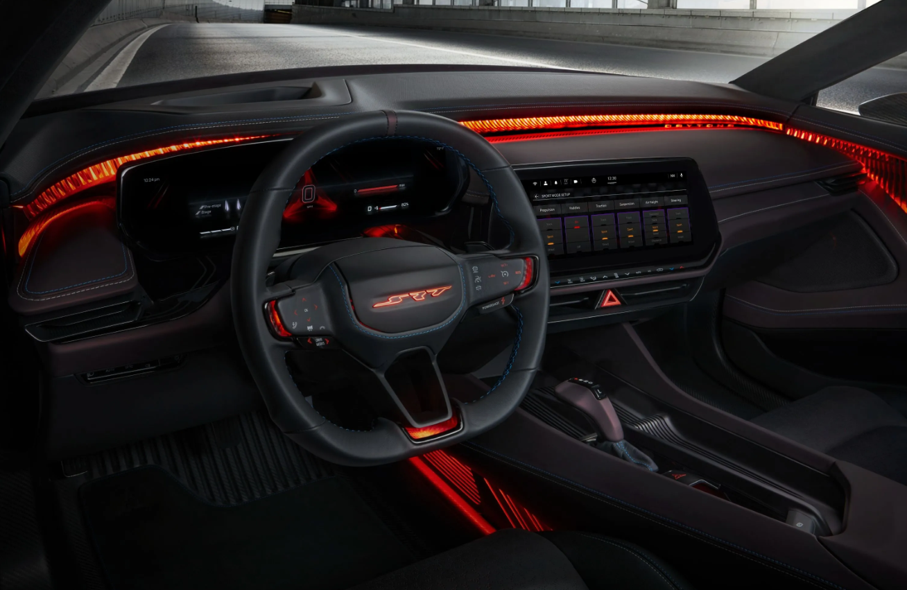 The 2025 Dodge Challenger’s interior will be roomy and comfy, with high-quality materials and high-end finishes. People driving and riding in the car can sit in adjustable seats that support and relax them. The car will also have high-tech and internet-connected features, like a giant tablet that can handle functions like navigation, music, and the car’s settings.