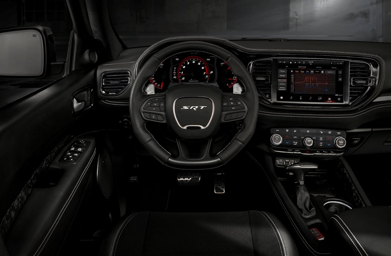 With room for up to seven people, the 2025 Dodge Durango SRT Hellcat will have a roomy and comfy interior. The seats will be made of Nappa leather with microsuede panels and SRT logos. They will also be able to heat and cool. That person behind the wheel will enjoy a flat-bottom steering wheel with paddle shifters, a digital instrument panel with red accents, and an infotainment system with a 10.1-inch tablet that works with Apple CarPlay and Android Auto. The car will also have a panoramic sunroof, a luxury sound system with 19 speakers, and an entertainment system for the back seats.
