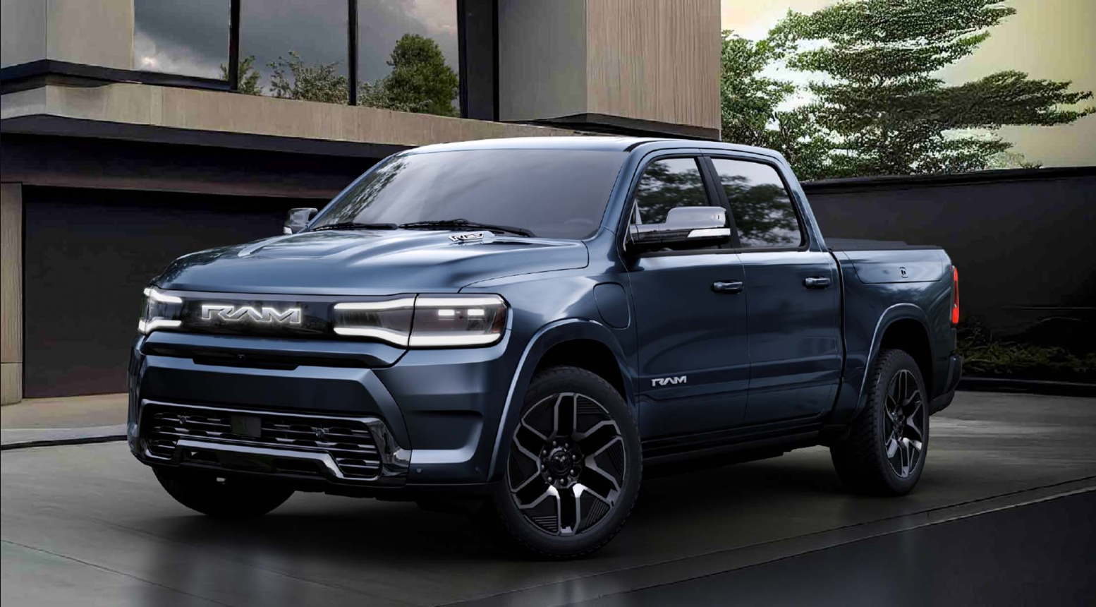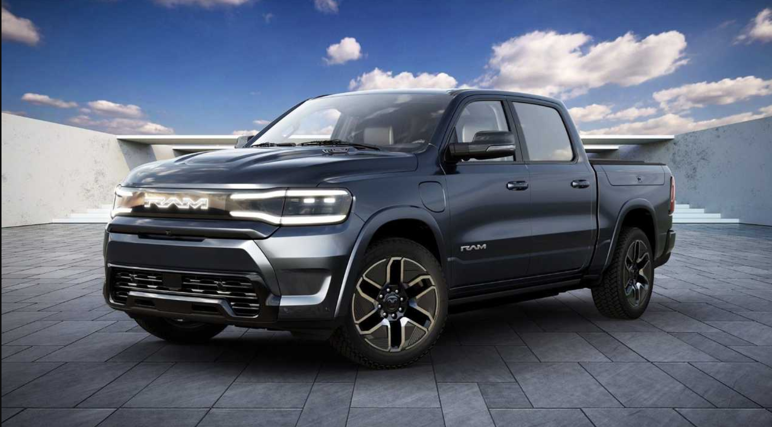 The Revolution model is a concept truck that previews a possible future electric version of the Ram 11500. The Revolution has a futuristic design, suicide doors, animated LED lights, and a transparent roof. It also has an electric powertrain that can deliver up to 800 horsepower and a range of over 300 miles.