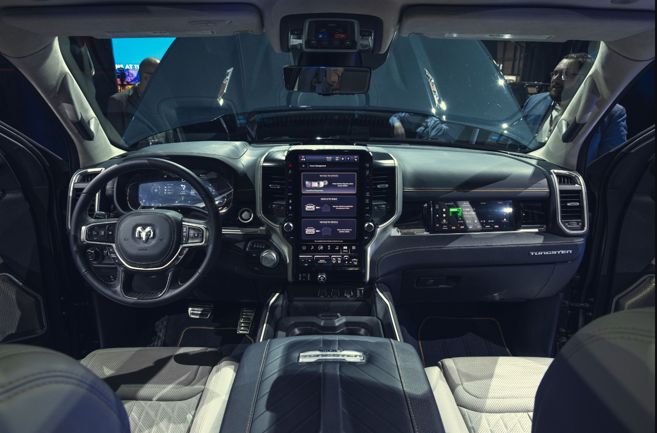 The 2025 Dodge Ram 1500 interior has also been updated with new materials, colors, and features. The dashboard has a more modern and sleek look, with a 12-inch touchscreen infotainment system that supports wireless Apple CarPlay and Android Auto. The center console has more storage space and a wireless charging pad. The seats are more comfortable and supportive, with optional leather upholstery and ventilation. The rear seats have more legroom and can fold flat for extra cargo space.