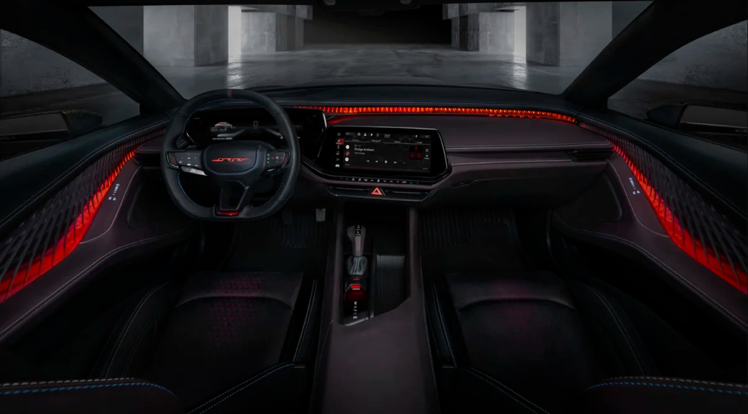 The 2025 Dodge Daytona’s cabin is roomy and comfy, with enough space for four people and their bags. The dashboard is simple and has a big 12-inch tablet that handles most features, like navigation, entertainment, climate control, and settings. The instrument panel is also computerised, and the information and gauges can be changed to fit your needs. There are paddle shifters and buttons for speed control, music, and the phone on the steering wheel. You can heat, cool, and rub yourself in these leather chairs. You can fold down the back seats to make more room for your stuff.